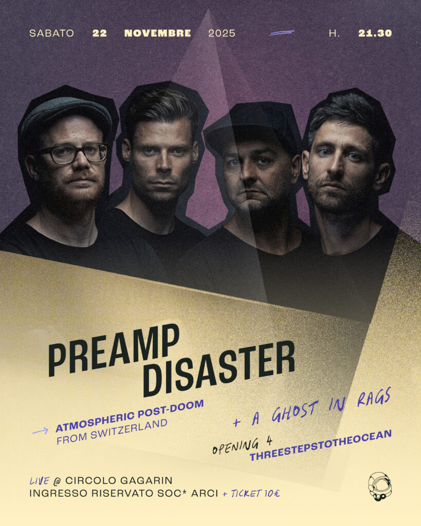 PREAMP DISASTER – quattro musicisti – 17 anni – una sola passione: la creazione di paesaggi sonori sferici ed epocali. Il risultato delle sessioni di jam e arrangiamenti è un post-doom atmosferico, duro come il metal, sperimentale come il post-rock, compatto come lo stoner rock.